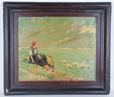 Firmato. "Contadinella Al Fiume Con Papere"