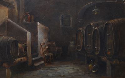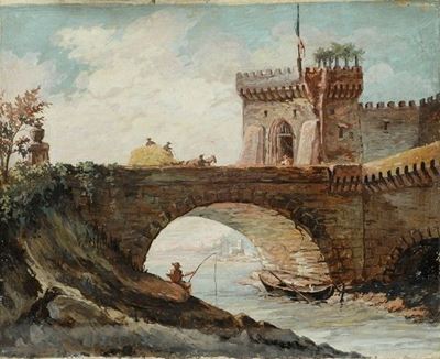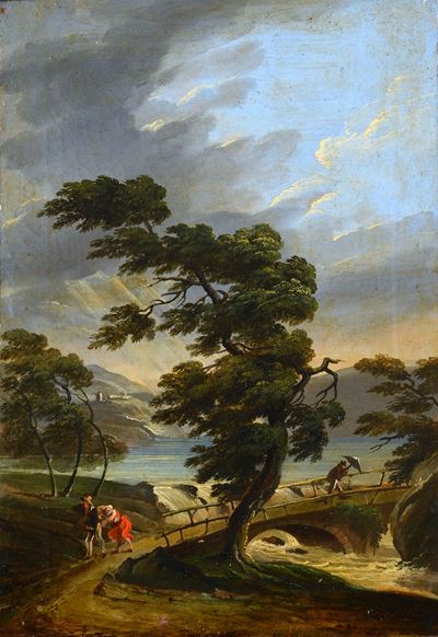 Paravento a quattro ante in cuoio dipinto con paesaggio campestre e figure. Inghilterra o Olanda,...