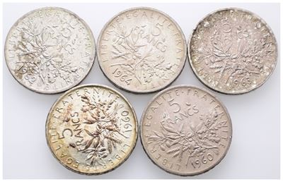 FRANCIA. Lotto DI 5 Monete. 5 Franchi 1960, 1962, 1963, 1963, 1964. Conservazioni Varie. Ag.