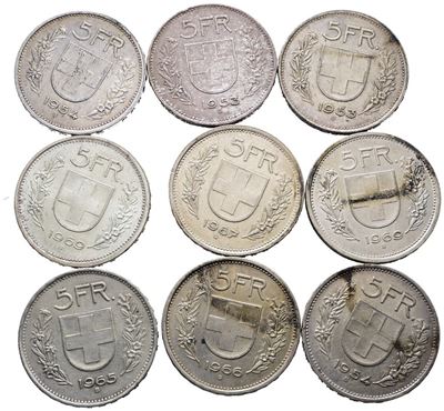SVIZZERA. Lotto DI 9 Monete Da 5 Franchi 1953 (2), 1954 (2), 1965, 1966, 1967, 1969 (2). Conserva...