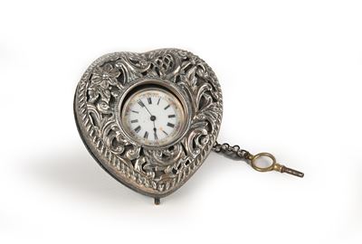 Porta orologio a forma di cuore in legno rivestito in velluto e lamina d'argento sterling Birming...