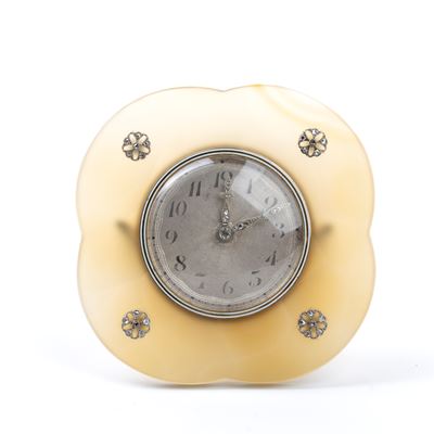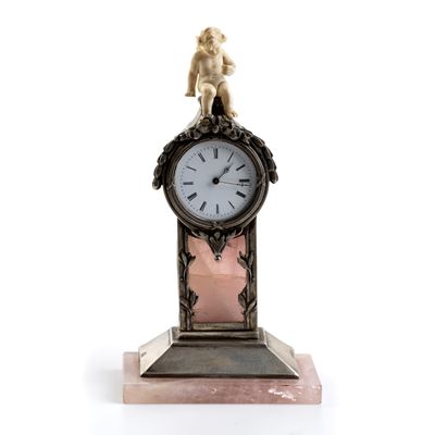 Orologio da tavolo in argento, quarzo rosa e avorio