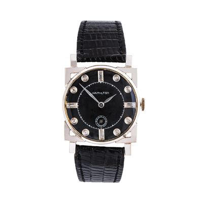 HAMILTON - ART DECO'OROLOGIO A CARICA MANUALE IN ORO BIANCO 14KT CON QUADRANTE NERO E INDICI DIAM...