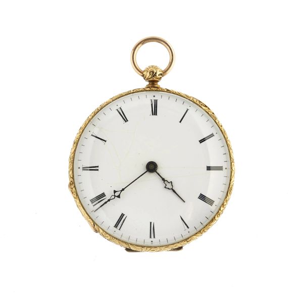 Orologio Da Tasca Monachina A Carica Remontoir Con Cassa Francese In Oro 18 Kt Con Smalti Raffigu...